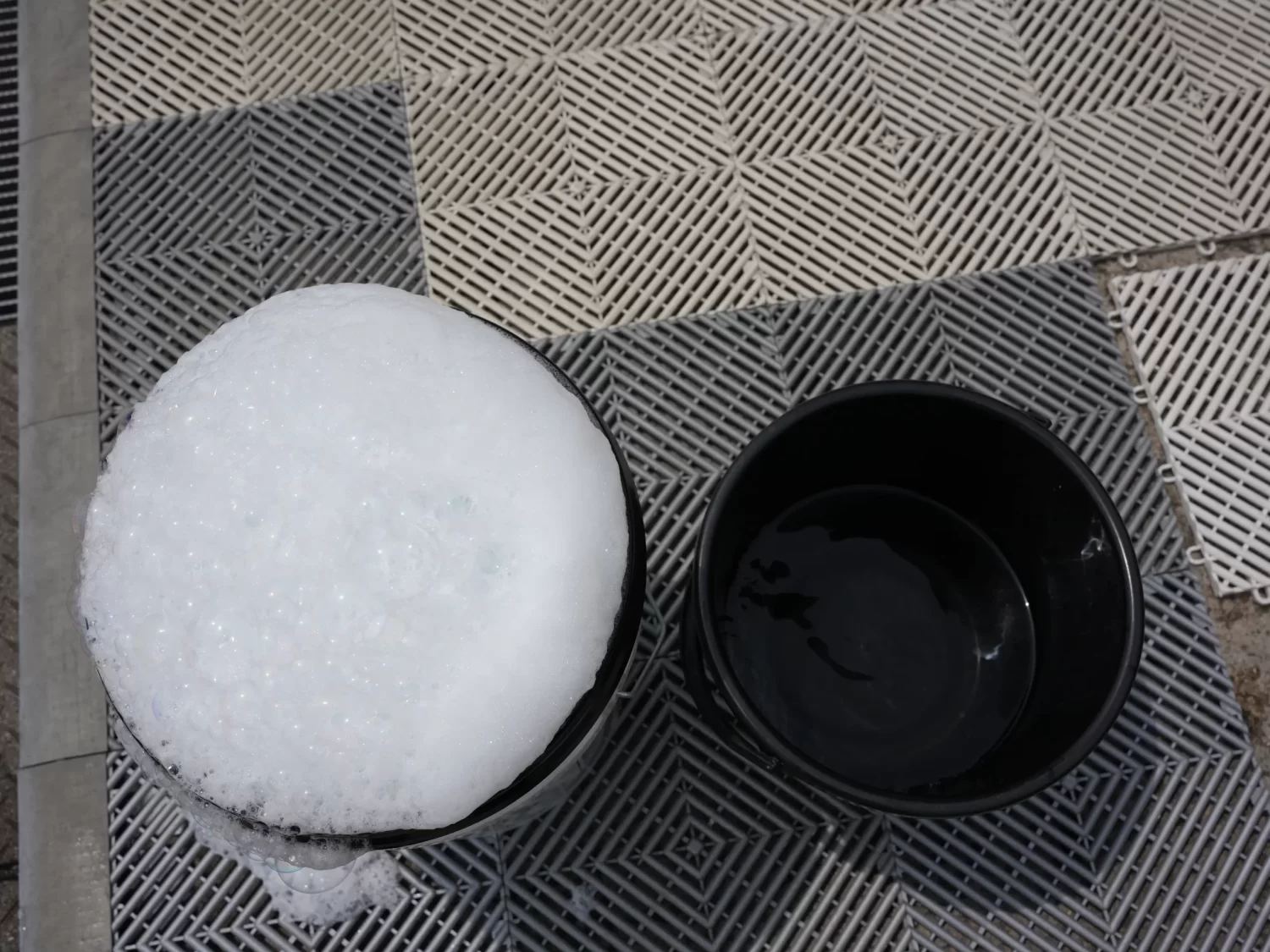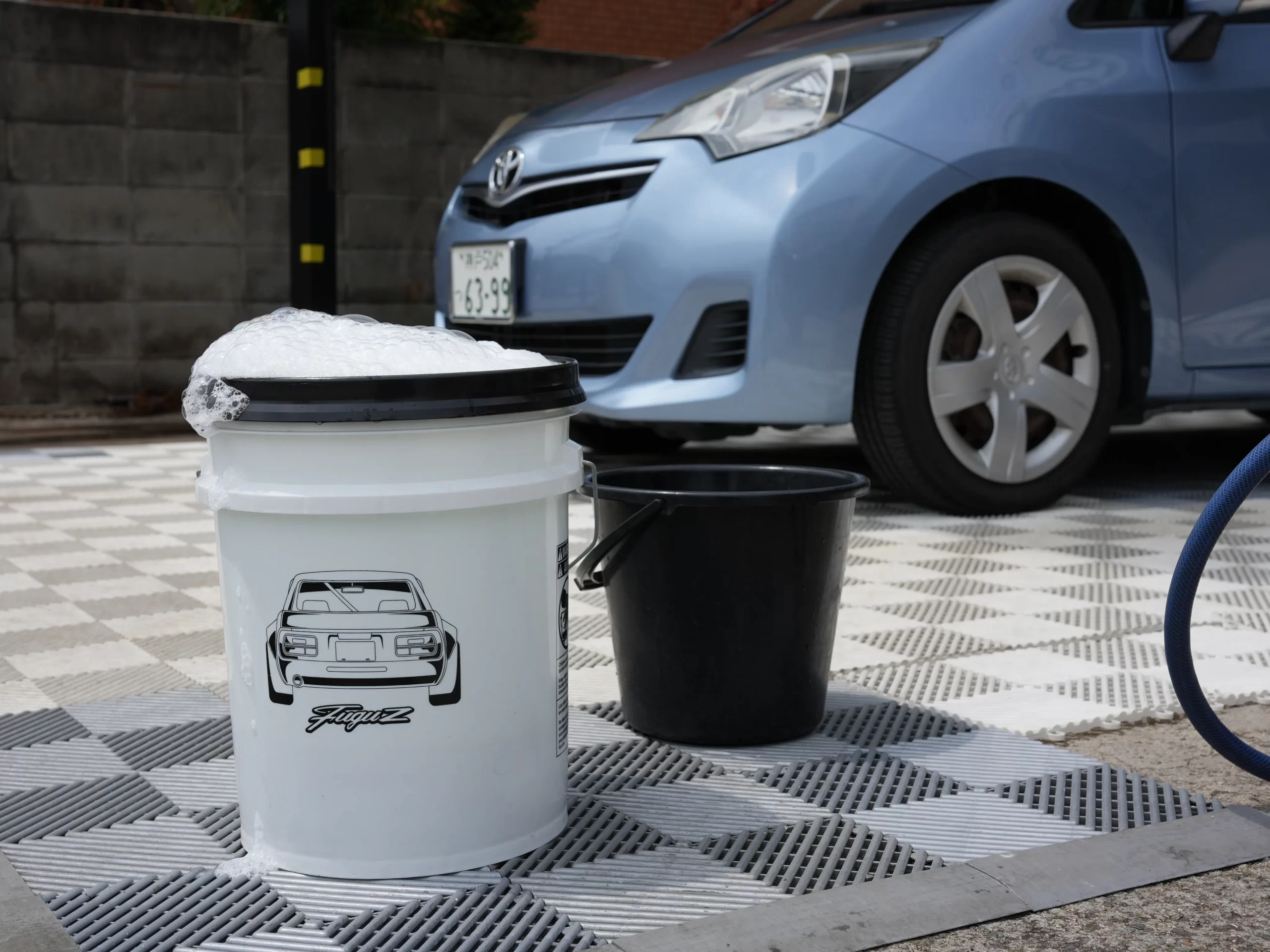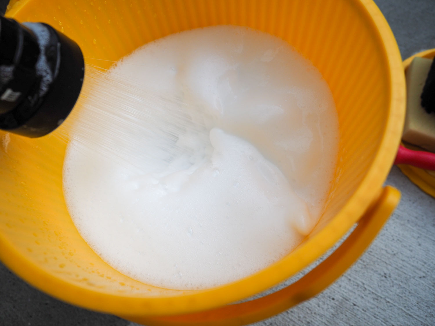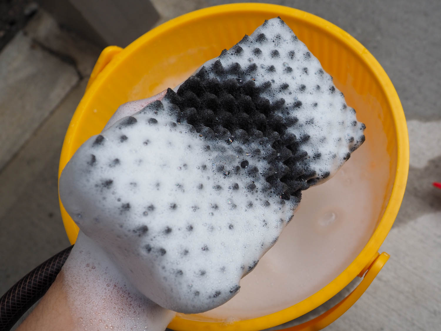 それよりも、普通のバケツを2個用意するのがオススメ。1つはシャンプー泡を取る用、1つはクルマを擦った後のスポンジを洗う用と使い分けることで、スポンジに付いた砂などによるキズリスクは十分抑えられます。
