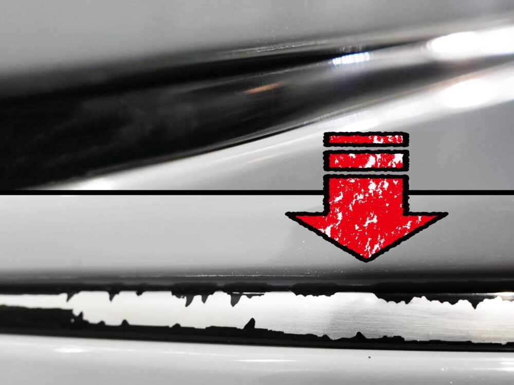 ショップ側のミス、第三者による犯罪もイヤなリスクですが、少し厄介なのが3つ目の「責任の所在が不明瞭」なトラブル。代表的なのが「新車の車両に発見された破損・汚損(小傷や塗装の欠け・剥がれ・肌荒れなど)」です。納車後に自走で持ち込んだ場合はもちろん、ディーラーから直接運搬した新車でも、こうした美観汚損が発見されるケースは珍しくありません。